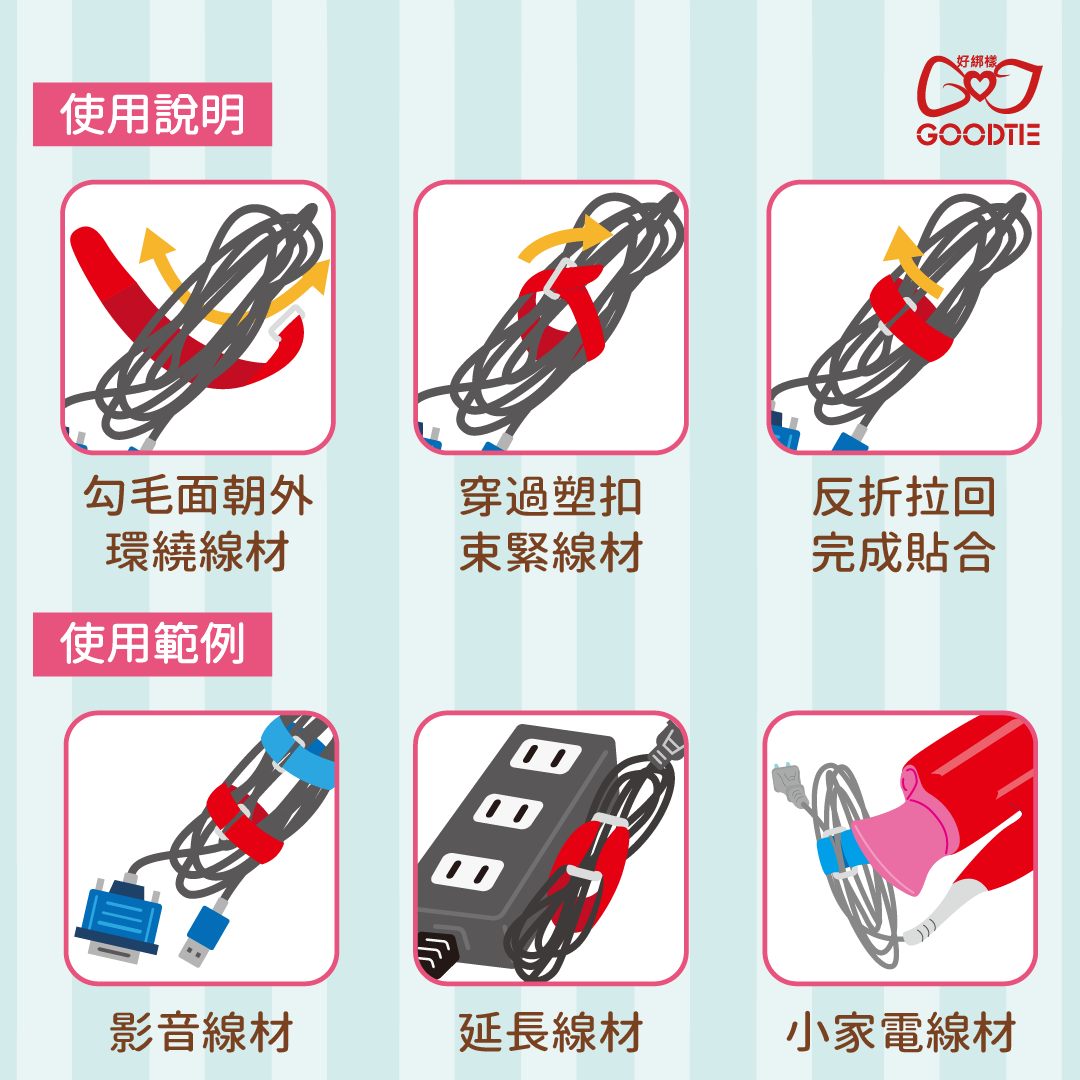 兩種收線方法 (1)整束包覆 (2) 夾收線圈,纏繞線材隨夾即收,解開使用時還可夾在線材上不怕弄丟哦~
