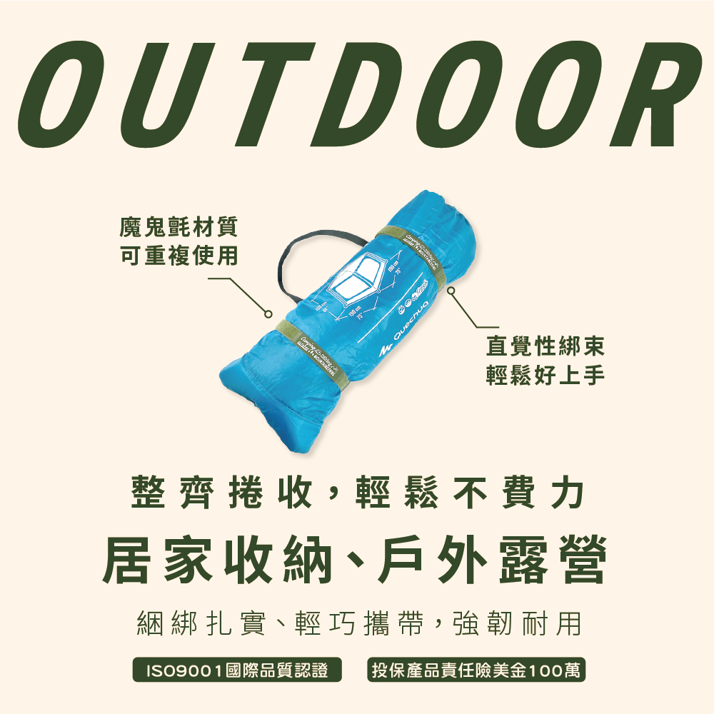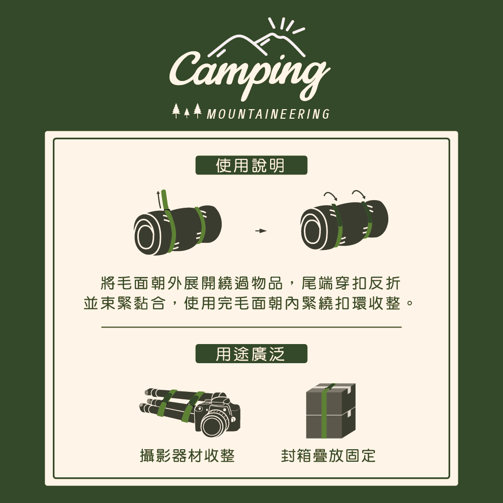 可用於帳篷、露營用具、盒箱打包、書報卷宗、瑜珈墊、攝影腳架收納等用途。